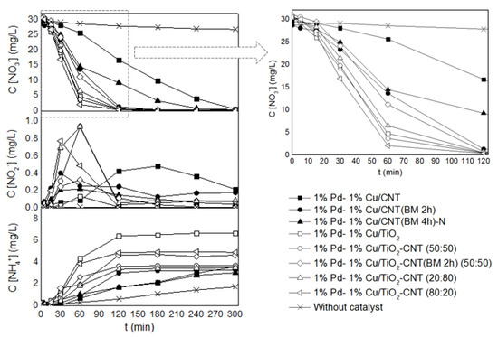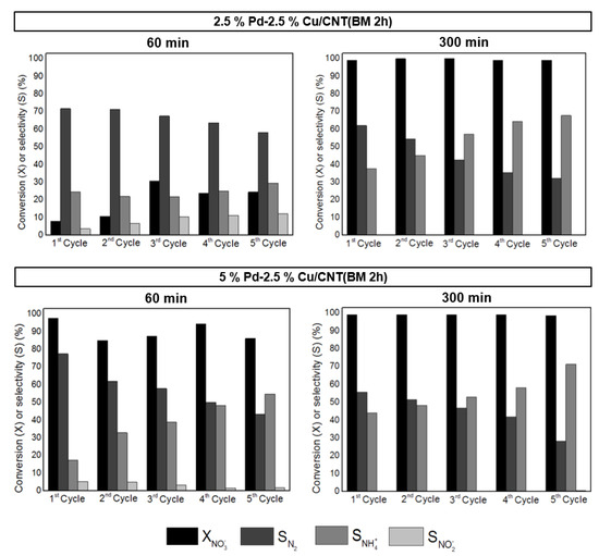 Taking into account the obtained results, and having in mind the real application of the developed catalysts, 5% Pd-2.5% Cu/CNT (BM 2h) and 2.5% Pd-2.5% Cu/CNT (BM 2h) samples were selected to perform reutilization tests. These catalysts were chosen to carry out more exhaustive tests considering the conversion and N2 selectivities achieved in the previous experiments.