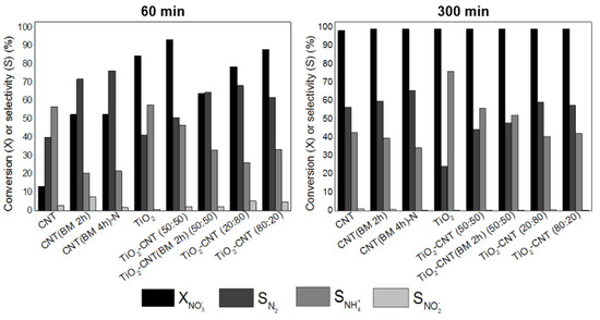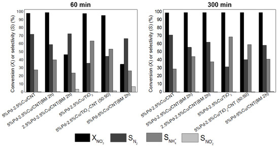 Figure 4 presents the conversion values and respective selectivities, for each of the synthesized catalysts, for a reaction time of 60 min and 300 min. This picture allows a better comparison of the efficiencies obtained for all the catalysts since, generally, all of them proved to be very active for NO3− reduction, achieving conversions very close to 100% after 5 h of reaction.