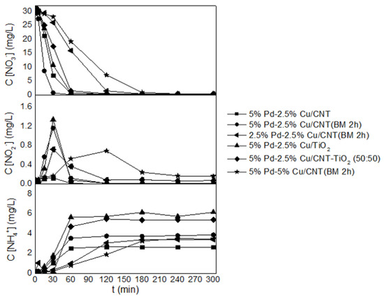 Figure 5 presents the nitrate concentration and respective evolution of NO2− and NH4+ concentrations during their reduction over the catalysts prepared. Figure 6 displays the corresponding selectivities after 60 and 300 min of reaction.