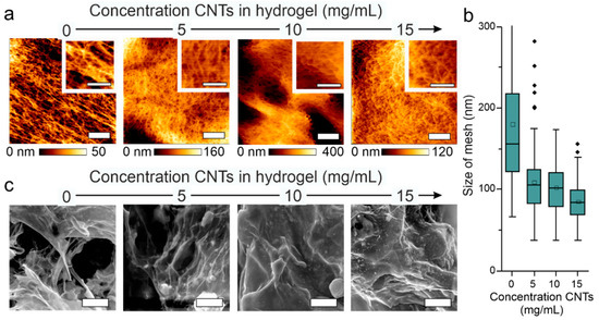 Macro image of all types of hydrogels can be seen in Figure S2b. The morphology of GG-CNTs hydrogels was studied using AFM and SEM (Figure 2a–c). CNTs concertation has a significant influence on hydrogel architecture. Particularly the mesh size decreased with increasing the concentration of CNTs in hydrogels (Figure 2b) from 180 ± 8 (SE) nm for pure GG to 85 ± 2 nm for gels prepared using 15 mg/mL CNT solution. As shown in a box chart, the dispersity of the mesh size decreases as well, which proves that the hydrogel with a higher concentration of CNT has a more regular structure. SEM images of the hydrogels revealed comparable high roughness on the GG-CNTs surface for samples prepared using CNTs of 5, 10, and 15 mg/mL, which is higher than that for control GG. This can be associated with the presence of CNTs conglomerates on the gel-mesh surface. To prove the presence of the CNTs inside hydrogels, we have conducted experiments with light absorbance by spectroscopy (Figure S2a), where a clear increase in adsorption is seen depending on the amount of CHTs in the hydrogels.