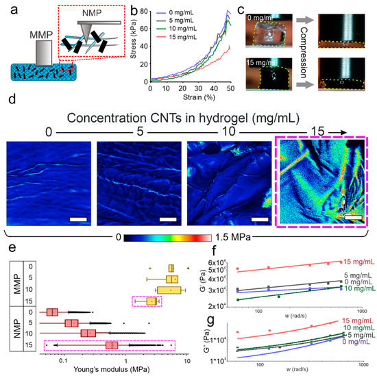 As a result of NMP characterization, the mapping of mechanical properties of the surface of hydrogels was carried out by AFM (Figure 3d). However, NMP of hydrogel with 15 mg/mL CNTs showed the best results, which can be seen from the figure, there all maps have the same force scale (0–1.5 MPa) (Figure 3d, purple frame). Force maps look dark blue, which indicates a low Young’s modulus compared to the sample prepared using 15 mg/mL CNTs solution. This result indicates the obvious presence on the hydrogel surface of rigid CNTs on the hydrogel with the concentration of 15 mg/mL. Concentrations below this value are not sufficient to obtain similar mechanical properties of hydrogel surfaces. For a better understanding of the difference between the MMP and the NMP, a graph was constructed comparing the MMP and the NMP (Figure 3e). It can be seen from Figure 3e that the mean Young’s modulus value of MMP decreases from 6.11 ± 2.98 MPa to 2.72 ± 0.86 MPa for CNT concentrations of 0 and 15 mg/mL, respectively. The Young’s modulus of NMP, on the contrary, increases from 0.06 ± 0.02 MPa to 0.64 ± 0.26 MPa for CNT concentrations of 0 and 15 mg/mL, respectively. The presence of a large number of drop-out points for NMP indicates that when scanning a surface, the cantilever often comes into contact with objects that significantly exceed the average Young’s modulus of the surface. The number of drop-out points increases upon increasing the concentration of CNTs. This behavior of mechanical properties can be explained by the peculiarities of the measurement. The UTM compresses the sample, therefore, the particles are then embedded in the structure of the hydrogel creating additional disturbances in the integrity of the lattice. At the same time, AFM senses the rigidity of the particles on the surface of the hydrogel, thereby increasing the average Young’s modulus. In addition to mechanical mapping, rheology study has been conducted.