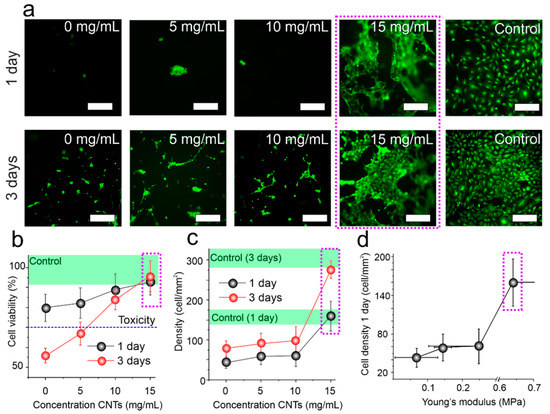 (a) Fluorescence microscopy images of MC3T3-E1 cells on GG-CNTs hydrogels surface. Cells on the the surface of a plastic cell culture dish are present as a control. Scale bars correspond to 250 µm. (b) Cell viability on GG-CNTs hydrogels as a function of the concentration of CNTs. (c) The number of cells adhered to the surface of the samples after 1 and 3 days of incubation as a function of the concentration of CNTs. (d) Cell density after 1 day of incubation versus Young’s modulus of GG-CNTs.