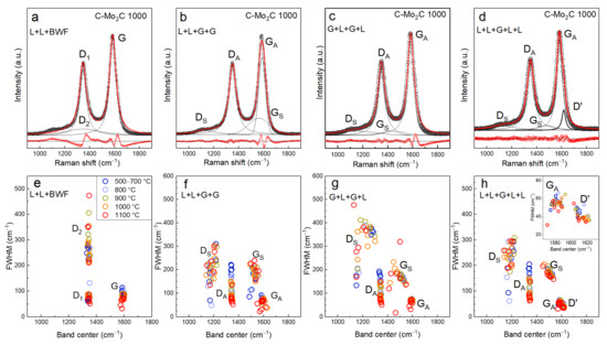 The main differences of the band positions and widths obtained with various deconvolution approaches become clearer by plotting the FWHM vs. the band center (x0) (as in [28]) (Figure 3e−h). Both the G-band and the D-band (denoted as D1 in Figure 3a) have a well-defined band center position and width according to all the different deconvolution methods applied. In the case of the 4-band deconvolution methods (Figure 3f,g) both the position and the FWHM of the DS, at ~1200 cm−1, and GS, at 1550 cm−1, bands are widely scattered. However, the scattering of both DS and GS band positions and the FWHM of the DS and GS bands are greater in case of the G + L + G + L approach in comparison to the L + L + G + G approach. In case of the 5-band deconvolution approach (inset in Figure 3h) the position of the D’-band is separated from the position of the GA-band. In addition, the position and width of the GS-band is better defined with the L + L + G + L + L approach (Figure 3h).