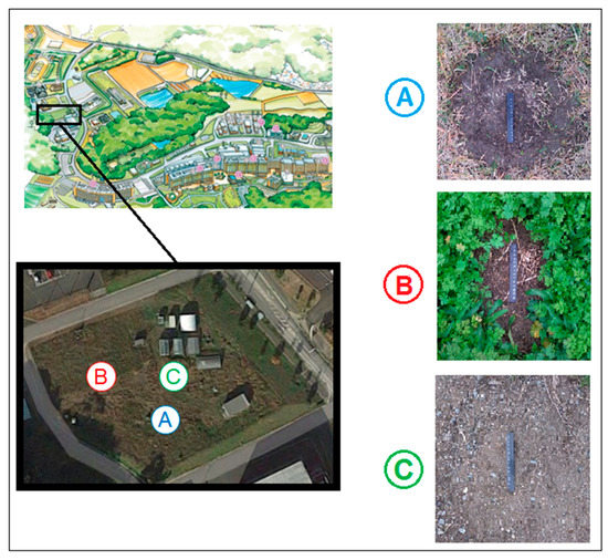 Map of the INAS test field study area with three different measuring locations, A, B, and C, located at Ito campus, Kyushu University, Japan. Because specific soil characteristics could influence results, the following three locations within the INAS test field were selected for our study: Location A: covered with leaf litter and several clusters of living grasses. Location B: soft soil surface covered with living grasses. Location C: hard soil with many pebbles and no grass or leaf litter.