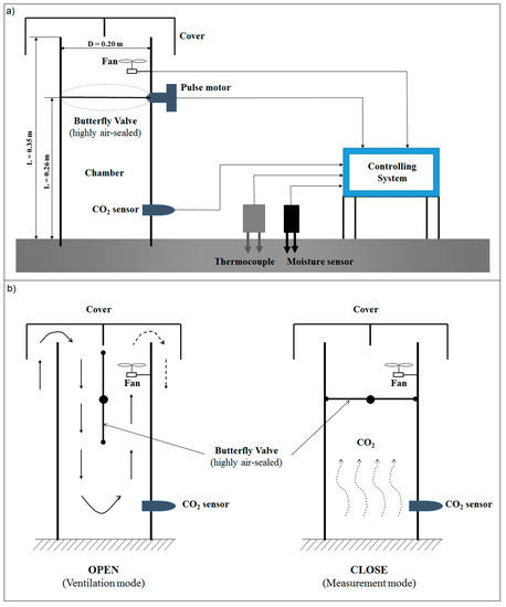 To accurately measure soil CO2 flux, the authors developed a soil CO2 flux measuring system based on the closed-chamber method that includes a measuring chamber and controlling system. An airtight chamber, 0.20 m in diameter and 0.35 m in height, was used to trap emitted gas from the soil (Figure 2). In addition, a CO2 gas sensor (GMP-343, VAISALA Inc., Helsinki, Finland) was used to measure CO2 concentrations and calibrated using ±0.5% accurate gases at 0, 200, 370, 600, 1000, 4000 ppm, and 2%. While a high butterfly valve with an automated close-open regime was located inside the chamber at 0.26 m from the soil surface, a circulated fan located at the top of the chamber was used to replace the air in the chamber with atmospheric air. Thermocouples (T-type, CHINO Inc., Tokyo, Japan) with a range from 0 to 200 °C and ±1.0 °C or ±0.75% in accuracy were set up to measure the temperature at different depths. Moisture sensors (EC-5, METTER Inc., Pullman, WA, USA) with a range from 0 to 100% were then inserted into the subsurface at a depth of 5 to 10 cm near the measuring chamber. A controlling system (Logger 308, CYBER MELON, Hyogo, Japan) was used to control and record signals from these sensors.