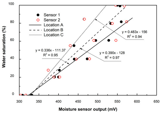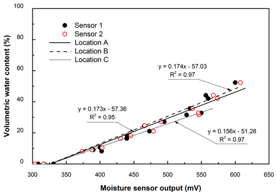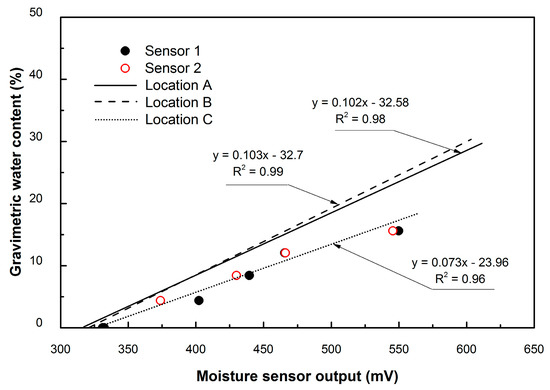 In this study, soil moisture was measured with soil moisture sensors using capacitance/frequency domain technology. Principally, soil capacitance is measured by the sensor output with a range from 0 to 2500 mV, equivalent to a moisture content of 0 and 100%, respectively. Therefore, soil moisture is calculated from the correlation between output voltage and measured soil moisture. As soil moisture–capacitance is correlated to soil type, the soil moisture output must be calibrated using the sampled soil. Several soil samples were taken from locations A, B, and C at the INAS test field to verify the correlation between the output voltage from soil moisture sensors and moisture measurements in the laboratory. Using this correlation, an appropriate amount of water was added to the dried soil in the laboratory to prepare mixed soil samples with different moisture contents. Soil samples were then packed into plastic containers that matched the original volume in the field. Two soil moisture sensors were inserted into the soil samples, and sensor outputs, water saturation, volumetric water content, and gravimetric water content of soils were recorded for varying moisture contents.