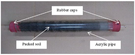 Soil packed into an acrylic pipe for measurement of gas permeability (6.38 cm2 cross-section, 21.8 cm length).
