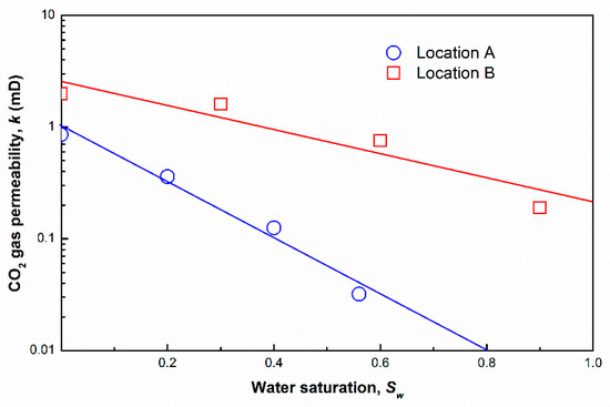 Carbon dioxide (CO2) gas permeability versus water saturation (Sw) at Locations A and B.