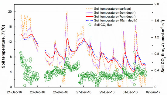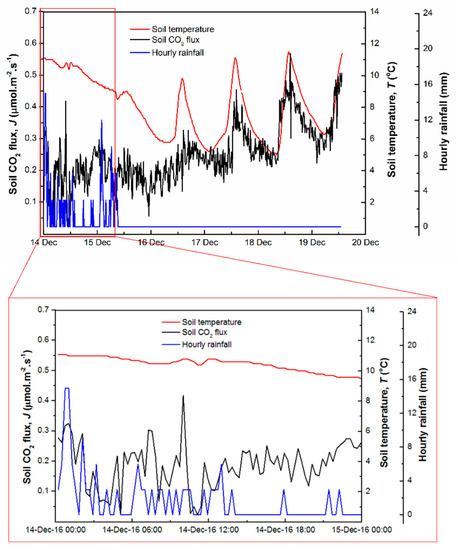 Together with the correlation between soil CO2 flux and soil temperature, we also investigated the effect of precipitation on CO2 flux. (Figure 10). Precipitation was recorded from Dec 14, 2016 (0:00 a.m.) to Dec 15, 2016 (0:00 a.m.), with no rain recorded from Dec 17, 2016 (0:00 a.m.) to Dec 19, 2016 (9:00 a.m.). Our results indicate a high correlation between CO2 flux from soil and soil temperature when precipitation was near zero (from Dec 17, 2016 (9:00 a.m.) to Dec 19, 2016 (9:00 a.m.)). On the other hand, during rainfall periods (from Dec 14, 2016 (0:00 a.m.) to Dec 15, 2016 (0:00 a.m.)), the correlation with soil temperature was unclear. We suggest that under saturated conditions, soil CO2 is partly dissolved by water and stored in the soil pores rather than being emitted to the surface. The amount of soil CO2 flux over rainy days (Dec 14–15) was substantially lower than that over dry days (Dec 17–19) by an average of 0.15 μmol·m−2·s−1. Therefore, we can conclude that precipitation caused a reduction in CO2 flux from soil.