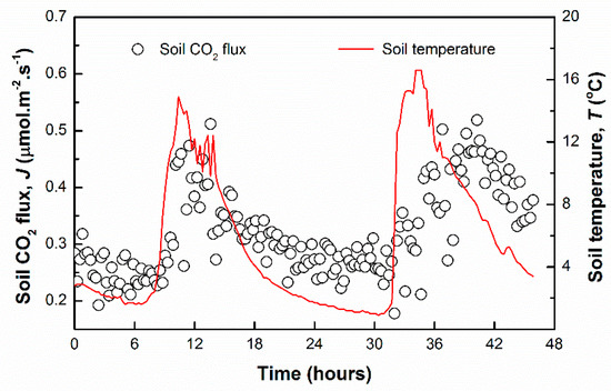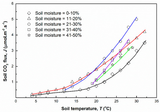 Results from our study indicate a general trend of an increase in soil temperature leading to an increase in soil CO2 flux (Figure 9). Notably, a similar tendency was observed with the vertical fluctuation of soil temperature and soil CO2 flux, indicating a specific correlation between soil temperature and soil CO2 flux. Furthermore, as soil temperature fluctuated ahead of the soil CO2 flux in both increasing and decreasing soil temperature trends, we conclude that CO2 flux from soils was affected by the respiration of plant roots and soil microorganisms. As described by Pavelka [28], CO2 molecules produced by respiration diffuse to the soil surface and are then released into the atmosphere. Therefore, soil temperature is a significant environmental factor that affects CO2 flux from soils.
