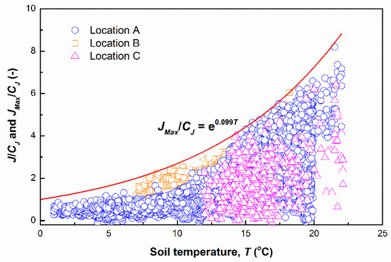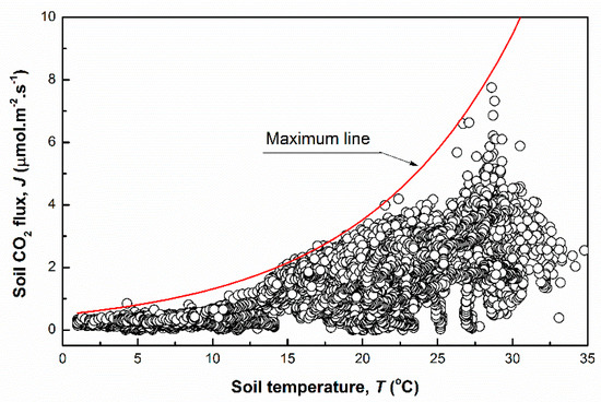 where JMax (μmol·m−2·s−1) is the soil CO2 flux from the soil surface, and T (°C) represents soil temperature.