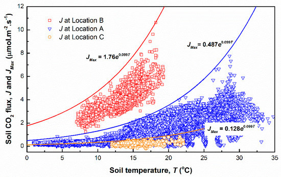 Comparison of the relationship between CO2 flux from soil (J) and soil temperature (T) at Location A (Dec 1, 2016 to Nov 26, 2017), B (Nov 1, to Dec 9, 2018), and C (Oct 25, to Nov, 2018).