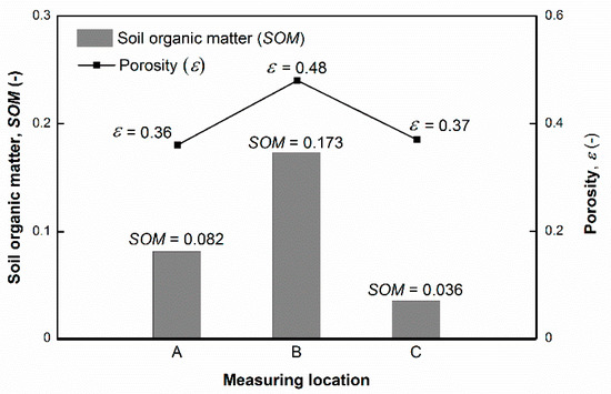 Soil organic matter (SOM) and porosity at three study locations (A, B, and C).