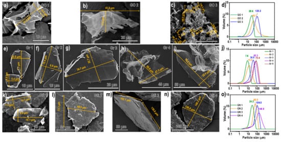 Representative FESEM images with PSD/LD plot of (a–d) GO 1–3, (e–j) Gr 1–5 and (k–o) Gft 1–4. Direct imaging technique (FESEM) was adopted to represent the size of GRM particles based on the 2D lateral dimensions as indicated by the orange solid line; Typical LD-particle size distribution (PSD/LD) plots based on median particle size by volume, d(50)v where the peak of the curve determined from their graphene, GO and graphite dispersions.