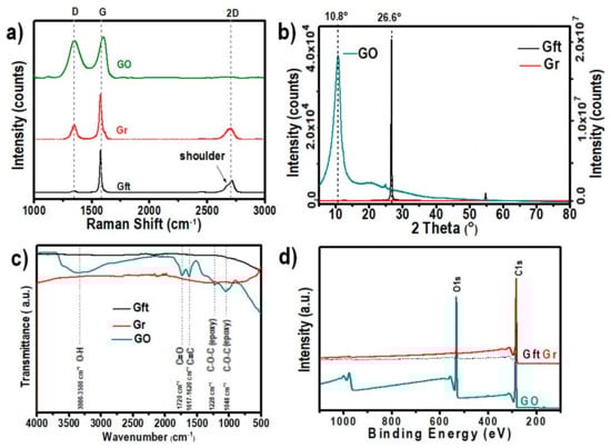 FTIR analysis of the carbon materials (Figure 2c) further corroborated the XRD results with the characteristic transmittance bands for oxygen functional groups including C=O (1720 cm−1), -OH (3000–3500 cm−1) and C-O-C (1228 cm−1 and 1048 cm−1) found in GO. Nearly a flat line with no obvious peak was detected for both Gft and Gr, suggesting no significant amount of oxygen functional groups was found in these two carbon materials [22,32].