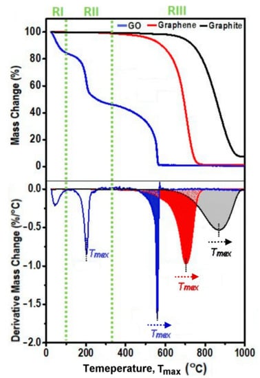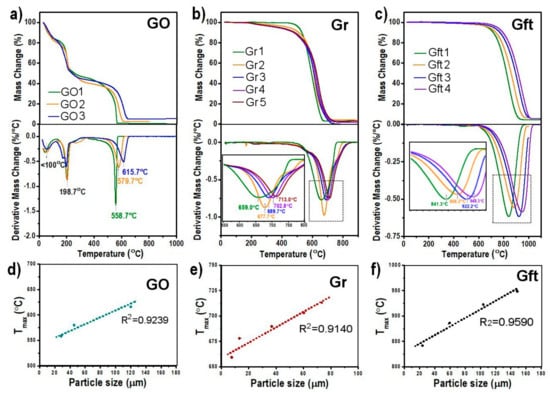 The key mass loss events of GO can be explained based on their decomposition temperatures: <100 °C for water elimination, 100–360 °C due to the removal of oxygen functional groups and 360–1000 °C can be linked to the oxidative pyrolysis of carbon framework [33]. It is worth mentioning that the first and second DTG peaks, representing the loss of water and oxygen functional groups events, did not vary significantly with different sieved size of GO samples. Similar to the third mass loss step of GO, the only DTG peak found in graphene and graphite samples can be ascribed to the combustion of carbon in the air condition. These DTG peaks appeared to change noticeably when varied size of carbonaceous materials were analyzed, which is the focus of our present study that will further unveil in the next sections. As depicted in the DTG graphs (bottom row of Figure 3a–c), their carbon combustion temperature was distinctly marked in terms of the temperature of maximum mass change rate (Tmax) with GO experienced the earliest carbon combustion (Tmax = 550–616 °C), followed by graphene (Tmax = 650–713 °C) and graphite (Tmax = 840–950 °C). The distinguished Tmax can be attributed to the maximum of the external heat energy required to overcome the strong bonding within their carbon lattice structure. The observed lower Tmax in GO indicated that less heat energy is required to overcome weaker non-graphitic sp3 hybridized carbon with a high density of defects after the rigorous oxidation reaction compared with graphene and graphite. GO also has high level of oxygen groups, which is an additional reason for lower level of energy for their decomposition. Graphene has higher Tmax because it needs larger amount of heat energy to break down the sp2 hybridized carbon atoms ordered by covalent bonds in a hexagonal carbon framework. Graphite, the most thermodynamically stable carbon materials studied in this work, demands even more heat energy due to its strongest 3D carbon network, consisting of a large number of graphene stacked layers held by additional van der Waals forces [21]. From these studies, it is obvious that Tmax can be regarded as a key parameter that can be used for their identification and specifically for detection of presence of GO and graphite impurities in graphene materials as summarized in Table S2.