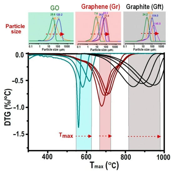 Representative TGA-DTG graphs and the Tmax values of graphene, GO, and graphite, which are used as foundation to explore the influence of particle size.