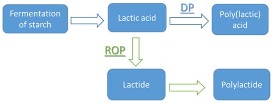 On the other hand, azeotropic condensation polymerization (ACP) and ROP are two methods for directly synthesizing PLA with high Mw. The former method (i.e., ACP) is similar to DP per se; the main difference lies in the use of the solvent in ACP to reduce the systems’ viscosity at high degrees of conversion [37]. Moreover, ACP produces high molecular weight polymer without chain extenders or adjuvants (unlike DP). The general steps of DP and ROP are shown in Figure 2. The main difference between these methods is that ROP involves an intermediate called lactide in the first step, which will be discussed later. Due to the existence of different preparation methods, two names can be interchangeably used to describe PLA, namely: poly(L-lactide) denotes the origin of the polymer from the cyclic monomer, or poly(L-lactic acid) to indicate the repeating acid unit in the polymer backbone, respectively. Thus, polymers obtained by polycondensation are usually referred to as poly(lactic acid) and those prepared from lactide as polylactides. In the present work, both types are abbreviated as PLA for simplification.