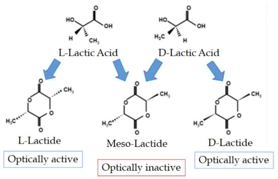 The monomeric unit of PLA is lactic acid with the formula CH3–CH(OH)–COOH, chemically known as 2-hydroxy-propionic acid. Lactic acid is chiral and has two stereoisomers (i.e., L-(+)-lactic acid or S-lactic acid and D-(−)-lactic acid or (R)-lactic acid), as shown in Figure 1 [14]. As the result of these stereoisomers, three different PLA materials can be expected, depending on the substrate material, such as poly(L-lactide) (PLLA), poly(D-lactide) (PDLA), or a racemic mixture called poly(D,L-lactide) or PDLLA. Most commercial PLA consists of copolymers of PLLA and PDLLA [15].