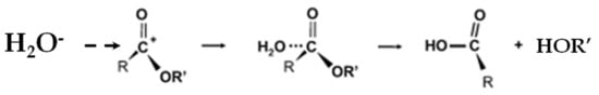 In general, the hydrolytic degradation of a polymer results from the interplay between chemical hydrolysis and diffusion of water and oligomers [2]. From the point of view of organic chemistry, the reaction is a bimolecular nucleophilic substitution (shown in Figure 5), and it can be catalyzed by either acids or bases [109]. Interestingly, the mechanism and kinetics of the hydrolytic degradation of PLA are governed by the pH of the sample’s environment. In particular, at neutral or basic pH, the hydrolytic degradation occurs preferentially through backbiting reactions, although a minor contribution of random scission hydrolysis was observed [91]. On the other hand, hydrolytic degradation of D, L-lactic acid oligomers in basic media showed random ester cleavage to be the primary mechanism [110], which is controlled by the rate constant, the amount of absorbed water, the diffusion coefficient of the chain fragments and finally by the solubility of the degradation products: lactic acid and lactide [7,99,110].