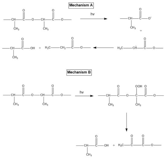 Another environmental factor influencing the degradation of PLA is exposure to UV light. It was found that UV light decreases the physical integrity of PLA, increases its brittleness, stress at break, and average Mw [21]. The photodegradation and other modes of PLA degradation will be described in more detail in the following paragraphs.