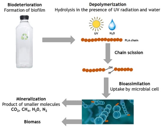 The term biodegradation is often used to refer to the degradation of PLA occurring in biological environments. The process is based on microorganisms (bacteria, fungi, and algae) using a polymer material as a source of energy for their life [86].