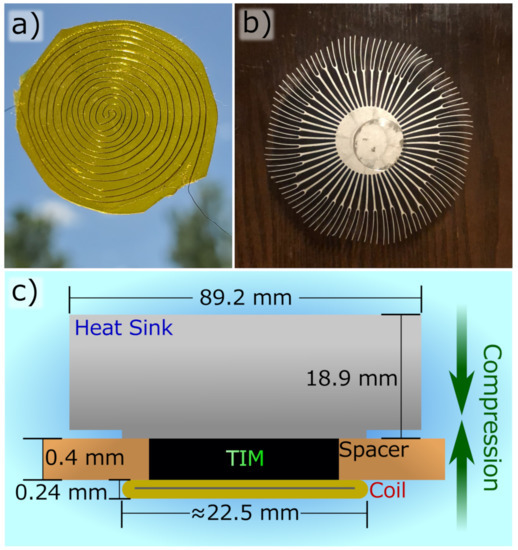 The heat sink was a stock unit sold in tandem with LGA-1155 socket processors, shown in Figure 1b, sourced directly from industry (Intel Corp. E97379-001, Santa Clara, CA, USA). To reduce experimental complexity and improve repeatability, the attached fan was removed. The heat sink was attached to TIM and heating coil in a passive cooling arrangement, resulting in increased thermal resistance, generating higher device temperatures than in an actively cooled setup, as intended by the product designers.