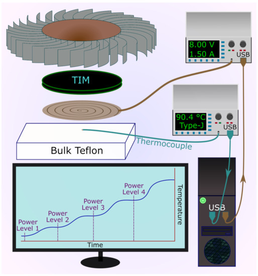 The heating coil, cured TIM, and heat sink assembly test vehicle is placed on top of a thermally insulating teflon plate with the coil side down in ambient atmosphere, shown in Figure 2. Between the teflon plate and the heating coil is a Type-J thermocouple (OMEGA Engineering, Inc., Norwalk, CT, USA) that probes the temperature of the heating coil itself, getting a direct measurement of coil temperature which is analogous to measuring the direct temperature of an electronic device. This entire vertical stack is lightly compressed in a clamp just enough to ensure the light thermocouple remains in place and in good contact. The clamp is imperfectly thermally isolated from the top of the heat sink with a small silicone pad insulation. The thermocouple was read with a voltmeter (Keithley 2182A, Solon, OH, USA). A computer running a python script retrieved temperature measurements from the voltmeter by passing standard commands for programmable instruments (SCPI) to it. In a similar fashion, the computer changed the coil heat dissipation rate via SCPI commands to the programmable power supply.