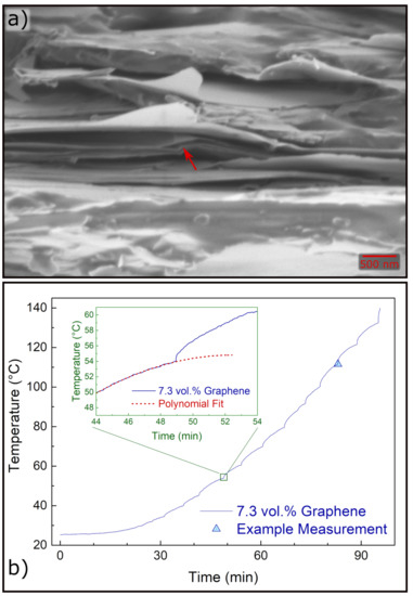 (a) Pseudo-colored SEM of a representative FLG composite with an arrow pointing to a definite FLG flake. (b) Thermocouple temperature readings over time in the course of an experiment.