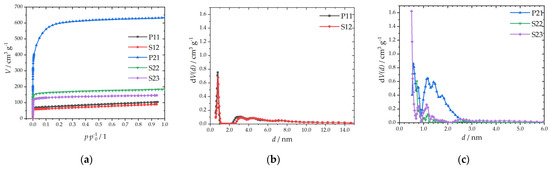 The prepared porous carbon fibers produced from viscose were further investigated by nitrogen adsorption isotherms at 77 K. As shown in Figure 1, all samples displayed a sharp rise of the N2 isotherm at the low-pressure range (p/p0 < 0.01), which indicates the existence of a significant amount of micropores [32]. These observations were further confirmed by the PSD plot derived by NLDFT (Figure 2). The PSD of the carbonized fibers P11 and S12 show a similar pattern with a high pore volume < 1 nm diameter. Moreover, the specific surface area, the total pore volume, and the average pore width, shown in Table 2, are almost identical.