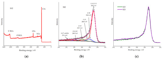 The results of the XPS analysis: (a) XPS survey spectrum of the ground sample S12; (b) chemical assessment of HR C1s spectrum of sample S22; (c) C 1s high resolution spectra of S22 and S23.