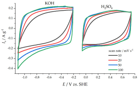 Table 5 summarizes the measured gravimetric capacitances in aqueous solutions. In general, the capacitances measured in the KOH solution were larger than the ones measured in the H2SO4 solution. The CF samples which were not activated showed lower capacitances than the activated samples, particularly in the H2SO4 solution. The situation was similar in the KOH solution, although the differences were somewhat smaller. At first glance, there is a rough correlation between measured capacitance and the specific surface area of the samples. Non-activated samples had the smallest capacitance, followed by the activated samples with the intermediate specific surface area. The highest capacitances in both aqueous solutions were recorded for the P21 sample, which had the highest specific surface area among the studied samples (Table 2). Figure 4 presents the CV curves for the sample P21.