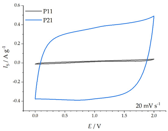 CV curves of samples P11 and P21 at the scan rate of 20 mV s−1 in TEMA BF4 in PC solution.