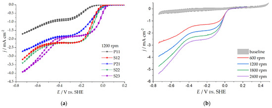 The results of the analysis of the ORR activity of studied samples in O2-saturated 0.1 mol dm−3 KOH solution: (a) background-corrected RDE-CV curves at a common electrode rotation rate of 1200 rpm for all the samples (potential scan rate 20 mV s−1); (b) RDE-LSV curves of the S23 sample at different electrode rotation rates.