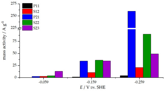 Considering the observed ORR selectivity, the studied materials all favored 2 e− reduction of O2 to peroxide, making them rather attractive for direct electrochemical peroxide generation [42]. However, another parameter, kinetic current, has to be taken into account as well. We can see that when the cathode polarization increased, the kinetic current rose, but at different rates. At −0.259 V vs. SHE (which is −0.5 V vs. SCE and 0.54 V vs. Reversible Hydrogen Electrode for pH = 13.5), the activated sample beat the non-activated ones and the kinetic current roughly scaled to the specific surface. Mass activities are easily obtained from kinetic currents by dividing the kinetic currents with the catalyst loading (Figure 7). We can see that the sample P21 topped out with a mass activity of ~250 A g−1, followed by the samples S22 and S23. Hence, we conclude that upon reaching high cathodic polarization when the charge transfer rate is much higher than the mass transfer, the specific surface takes the dominant role over the surface chemistry and determines the overall ORR activity. For this reason, we believe that sample P21 would be a perfect candidate for the electrochemical generation of peroxide, where diffusion limitations are less pronounced compared to the RDE experiments.