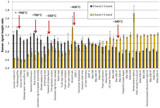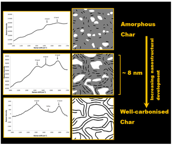 Raman spectroscopy can be used as a rapid, non-destructive technique for analysing the chemical structure of samples. Raman spectrometers have become more obtainable and portable in recent decades, with different handheld devices now available [4]. A Raman instrument which uses a visible or infra-red laser is also particularly sensitive to the nanostructure of materials which are rich in sp2-bonded carbon and this makes the technique a valuable tool for studying many different carbon-rich materials including graphites, coals, cokes, carbon fibers, fullerenes, soots, carbon nanotubes, amorphous carbons, and different types of graphenes [5,6,7,8]. Raman spectroscopy measurements have previously been used for evaluating the heat treatment temperature (HTT) of chars produced from Japanese cedar and proposed as a means of quality control for charcoals [9]. In more recent research, wood and cellulose-based precursors have been charred and carbonised under laboratory conditions at a range of HTTs and these researchers have reported correlations between measurements of various features in Raman spectra of chars and the HTTs used to produce those chars [6,10]. Raman spectroscopy has been also used to analyse terra preta char samples from locations near Manaus, Brazil [7]. Terra preta char-rich soils were an inspiration for the biochar concept [11,12].