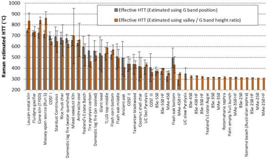 The carbonaceous samples that were not recently produced biomass chars (such as the anthracite coal, tire pyrolysis carbon, and two char samples from archaeological/volcanic sites) appeared as significant deviations from the overall trends for chars in Figure 4. The anthracite coal sample had a lower D band/G band height ratio than neighbouring chars given its G band position-based rank (Figure 4). This indicates smaller graphene-like domains in the coal sample and/or potentially greater compressive stress on the domains with this likely relating to differences in coal formation (presumably formed at lower temperatures and under compressive stress [33]). There was considerable variation in sub-sample spectra of anthracite coal, with some spectra having amorphous features similar to those found in very low HTT chars and other spectra having features similar to those of well-carbonised chars with apparent overlap in most coal sub-samples. Certain components (macerals) of coals, known as fusinite [34] or fusian [35,36], are considered to have a pyrogenic origin as chars. They are formed in higher temperature vegetation fires then deposited into the organic material, which is eventual formed into coal (Fusian can make up 10–20% of some coals [36]). The tire pyrolysis carbon sub-samples also demonstrated considerable variability with regions of reasonably well-carbonised material (presumably from the carbon black component of the tires) and a more amorphous material (presumably formed in the pyrolysis process reported to operate around 410 °C) which appeared to overlap in many sub-samples.