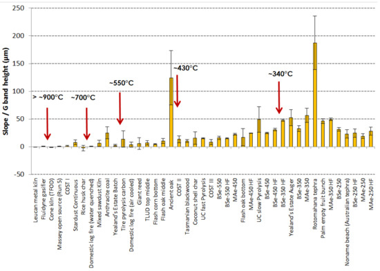 Slope value relative to the G band height. Samples are ranked along X-axis from the highest value of apparent G band position on the left to lowest on the right. Error bars represent 99% confidence intervals. Large positive values for this slope-based parameter indicate hydrogen-rich amorphous carbon. These red arrows are used for approximate signposts for “effective HTT” based on comparisons to a set of laboratory produced chars.