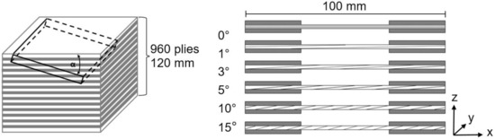 Figure 1. Schematic representation of a cube consisting of 960 plies used to cut specimens with out-of-plane fibre angles with respect to the panel surface. Schematic cross-sections of tensile test specimens are shown on the right side.