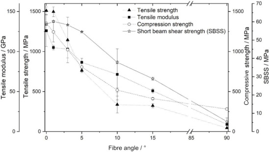Figure 3. Mechanical performance of CFRP samples with an out-of-plane fibre orientation. (Given strengths are calculated for the initial cross-sections of the samples and not the area of failure (see text).)