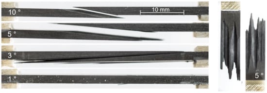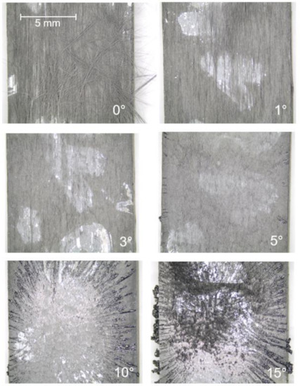 The decomposition of the polymer matrix leads to the formation of a liquid. This liquid is observed at the sample surface. In Figure 14, the surfaces of the samples with various out-of-plane fibre angles are shown after 60 s of hot-air impact. For an out-of-plane angle of 0°, loose fibres are observed, which are easily removed from the surface. For an angle of 1°, a rough surface can still be found, but it has less loose fibres. With an angle of 3°, the surface is formed like scales and no more loose fibres are found. Beginning from 5°, traces of a condensed, solid pyrolysate of the matrix are observed. Corresponding to the increasing mass loss and the reduced barrier effects for high out-of-plane fibre angles of 10° to 15°, the amount of condensed pyrolysate increases and a radial symmetric structure forms, which is caused by the impinging air.