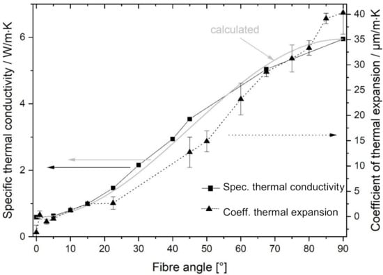 Figure 5. Thermal conductivity at 15 °C, additionally calculated according to Equation (1) and thermal expansion coefficient of CFRP with given out-of-plane fibre orientation.