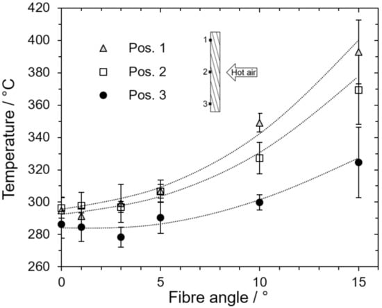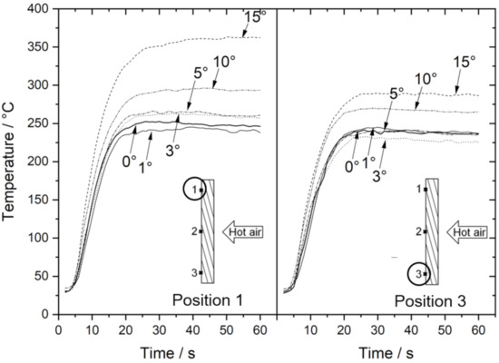 The recorded temperature rises on the back side of the samples with an out-of-plane fibre orientation are given in Figure 8 and Figure 9, summarising maximum temperatures averaged for all conducted experiments with hot air after 60, 300 and 600 s. An equilibrium temperature is reached after ~25 s. For an out-of-plane fibre angle of 0°, a homogeneous temperature distribution (~240 °C) is observed at the samples’ back side, as temperature curves at position 1 and 3 are nearly identical. For higher angles beginning from 3°, equilibrium back side temperatures are, in general, higher due to the increased thermal conductivity of the samples (see Figure 5) and especially higher at position 1 compared to position 3. For an angle of 15°, temperature difference between position 1 and 3 on the back side is ~70 °C (see also Figure 9). The preferred heat conduction along the fibres leads to an increasing temperature difference between position 1 and 3. At position 3, the reached temperatures are lower. As for high out-of-plane fibre angles, no fibres with a fibre end at the thermocouple position on the back side reached the front side. Such fibres only reached the lower edge of the sample (see inserted schemes in Figure 8 and Figure 9). At position 1 and 2, these effects are less pronounced, and occurring temperatures better represent those of a large component. The observed temperature differences in the equilibrium state of the experiment prove that more heat is conducted to the samples´ back side for increasing out-of-plane angles.