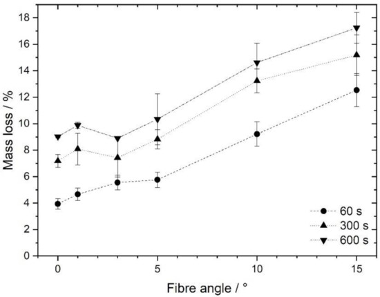 To measure the effect of different fibre angles on thermal damage, first mass loss due to the decomposition of the polymer matrix is determined. The results are shown in Figure 10. Mass loss increases with time of thermal load (60, 300 and 600 s) but is more pronounced with an increasing fibre angle. As after ca. 25 s equilibrium back side temperatures are reached (see Figure 8), the increasing thermal decomposition of the resin matrix, in general, occurs with an increasing duration of thermal loading at certain temperature levels. However, when comparing samples with 0° and 15° out-of-plane angles, mass loss is 2 to 3 times higher for samples with 15°. According to the higher reached temperatures through the thickness of the panels with high out-of-plane fibre angles, extended matrix decomposition is responsible for the observed mass loss.