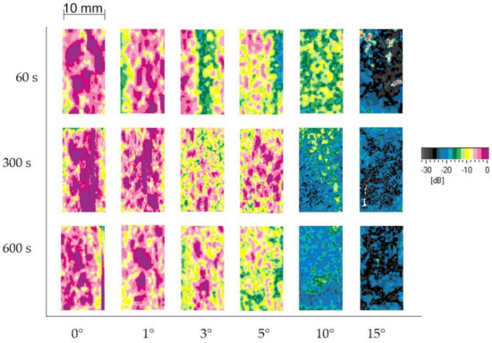 Figure 11. Ultrasonic C-scans from the back side of samples with various out-of-plane fibre angles after hot-air treatment for 60 to 600 s.