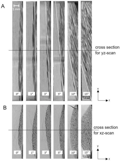 Figure 12. Microfocused computed X-ray tomography (µCT) analysis of CFRP samples with out-of-plane fibre orientation after 60 s of the hot-air treatment. (A): xz cross-section with indicated out-of-plane angle (white line); (B): yz cross-section.