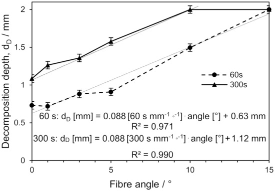 In Figure 13, the maximum depths of resin-depleted areas are presented as being dependent on out-of-plane fibre angle after 60 and 300 s of thermal treatment. After 60 s, 0.73 mm of the material without out-of-plane fibre orientation is penetrated, corresponding to an average decomposition velocity of ~12 µm per second perpendicular to the fibres. With increasing out-of-plane fibre angles, the penetration depth increases. With a nearly linear increase in the penetrated depth for fibre angles up to 15°, an additional contribution to this velocity by the out-of-plane fibre angle of roughly 1.5 µm per second and angle degree is calculated (see linear regression in Figure 13: 0.088 mm/60 s = 1.47 µm/s). Therefore, decomposition velocity in depth direction is ~33 µm/s for the sample with an out-of-plane fibre orientation of 15°. For a hot-air treatment up to 300 s, a penetration depth of 1.1 mm is observed, and an average decomposition velocity of 3.6 µm per second is calculated for the material with a 0° out-of-plane fibre orientation. An additional contribution to this velocity by the out-of-plane fibre angle is roughly 0.3 µm per second and angle degree (see Figure 13: 0.088 mm/300 s = 0.29 µm/s). Therefore, the sample with an out-of-plane fibre angle of 10° is already completely penetrated.
