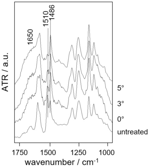 Figure 16. Infrared spectra (µ-ATR-FTIR) in the center of the samples’ back side (position 2 in Figure 2) with a given out-of-plane fibre angle after 300 s of hot-air treatment.