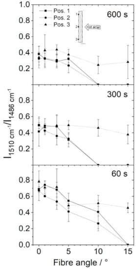 Moderate polymer degradation can be measured by FTIR spectroscopy on the back side of the samples. Figure 16 shows results for the samples with different fibre angles. The obtained spectra are typical for the 8552/IM7. A detailed assignment of bands is given in [29]. Characteristic bands at 1510 and 1486 cm−1 are attributed to the epoxy resin and the polyethersulfone (PES), respectively [29]. A broad signal at 1650 cm−1 originates from carbonyle species in oxidation products. With an increasing out-of-plane fibre angle, the band at 1510 cm−1 loses intensity, which corresponds to a preferred degradation of the epoxy resin. As can also be seen in the thermogravimetric analysis, the epoxy resin in 8552/IM7 is less thermally resistant than the polyethersulfone. Therefore, a lower ratio of the intensities of the signals at 1510 and 1486 cm−1 (I1510 cm−1/I1486 cm−1) corresponds to a more pronounced thermal degradation [26]. In Figure 17, this intensity ratio is given for the three positions on the back side of samples with different out-of-plane fibre angles after different durations of hot-air treatment. With increasing time, the observed intensity ratios are, in general, lower, indicating the proceeding thermal degradation of the polymer. For increasing fibre angles, a more pronounced polymer degradation occurs corresponding to the higher measured back side temperatures (see Figure 8). As expected, the thermal degradation of the polymer is only slightly depending on the fibre angle at position 3. At position 3, temperatures are lowest and least dependent on fibre angle. In contrast, at the other positions, matrix decomposition increases more strongly with an increasing fibre angle, as more heat is conducted to these areas on the back side of the samples. For example, after 60 s of thermal treatment, the samples with an out-of-plane angle beginning from 15° show a complete decomposition of the epoxy resin at the center of the samples´ back side (positions 1 and 2), whereas for the 10° sample, resin remains. After 300 s, the sample with a 10° out-of-plane fibre angle also shows a complete decomposition of the matrix at the center of the back side. These observations correspond to the maximum depths of resin-depleted areas traced by µCT (Figure 12).