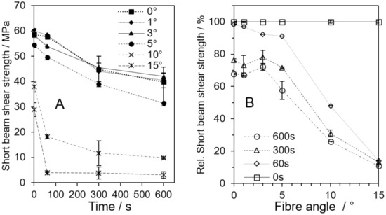 Figure 18. Short beam shear strength of samples after hot-air treatment. (A): dependent on loading time; (B): each sample related to the corresponding sample with the same out-of-plane fibre angle but without thermal treatment (0 s).